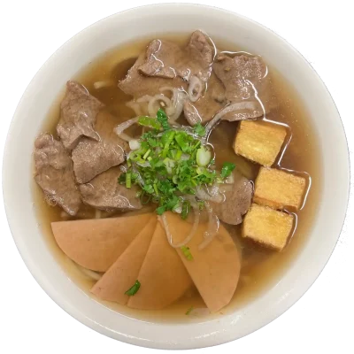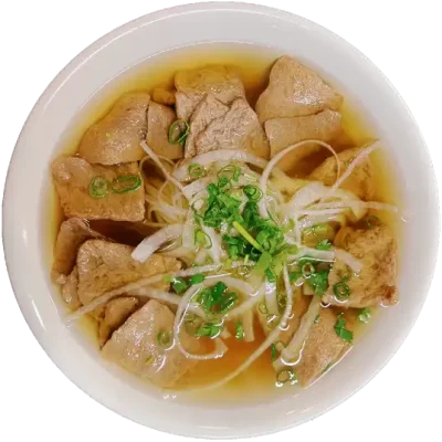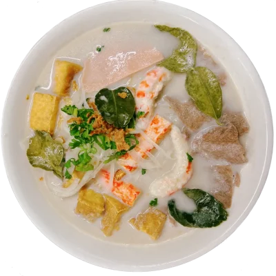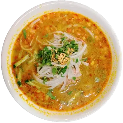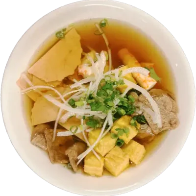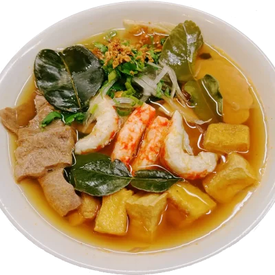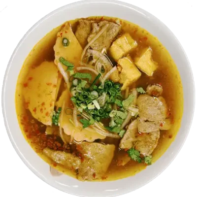 Hot & sour vegetable broth, rice noodle, veggie based seafood and fried Tofu. Topped with onion, and cilantro. Fried tofu is available for Gluten-free friendly option.