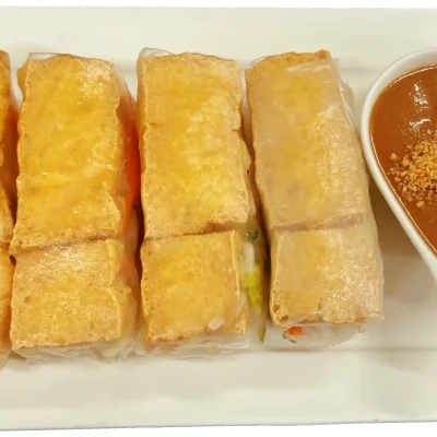 Fresh rice-paper wrapped with fried-tofu, lettuce, cucumber, beansprout, carrot. Dipped with peanut sauce or vinaigrette sauce for gluten-free friendly option.