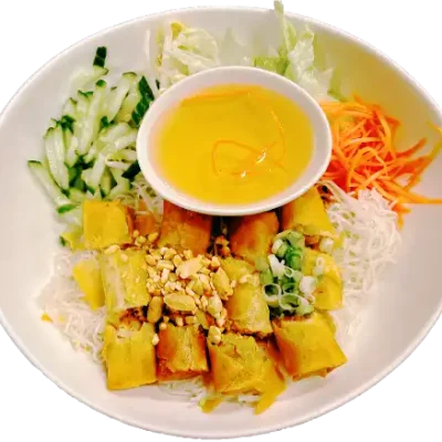 Vermicelli noodle or steamed rice or ( coconut rice +1.95), vegan spring roll, shredded lettuce, cucumber, pickled carrot, beansprout. Topped with roasted peanut, green onion. Served with vinaigrette sauce.