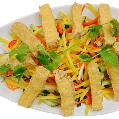 Shredded mango, red onion, carrot, cucumber, red bell pepper, tossed in a tangy vinaigrette sauce. Topped with fried-tofu, roasted peanuts, and fresh cilantro.